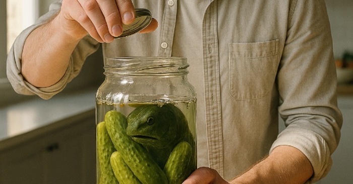 Mark set the jar on the table, grabbed the opener, and with a soft pop removed the lid. Instantly, the familiar smell of brine and dill filled the air. But when he looked inside, he froze. Among the pickles, half-hidden by the cloudy brine, was a dark green shape. At first he thought it was just a badly peeled cucumber. But then he realized — it wasn’t a vegetable.