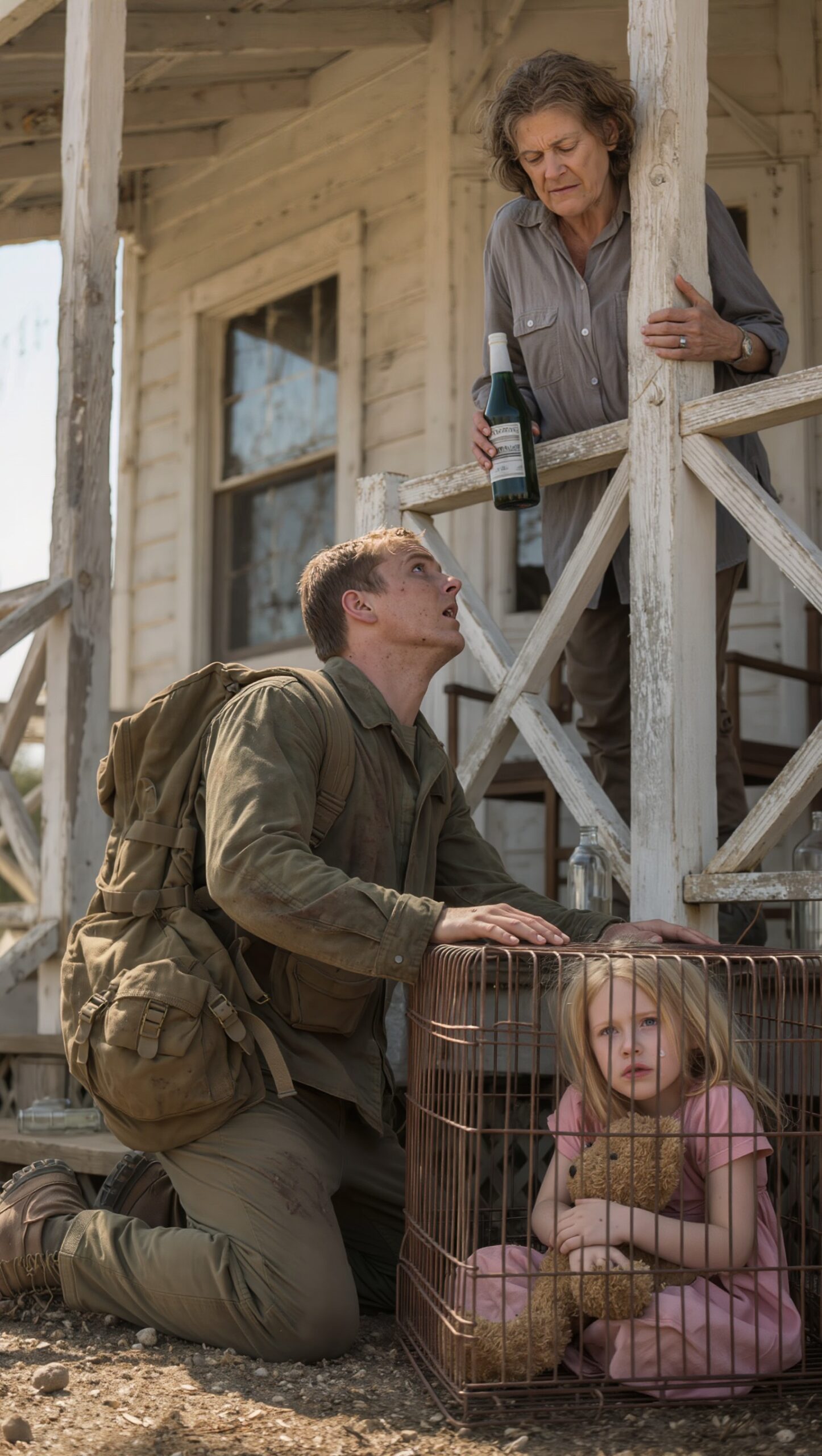 In the shadow stood a small rusted cage, and inside — his five-year-old daughter Lily. She clutched an old teddy bear, her face dirty, eyes red. She sat on a blanket, knees drawn to her chest, whispering a little song to herself.